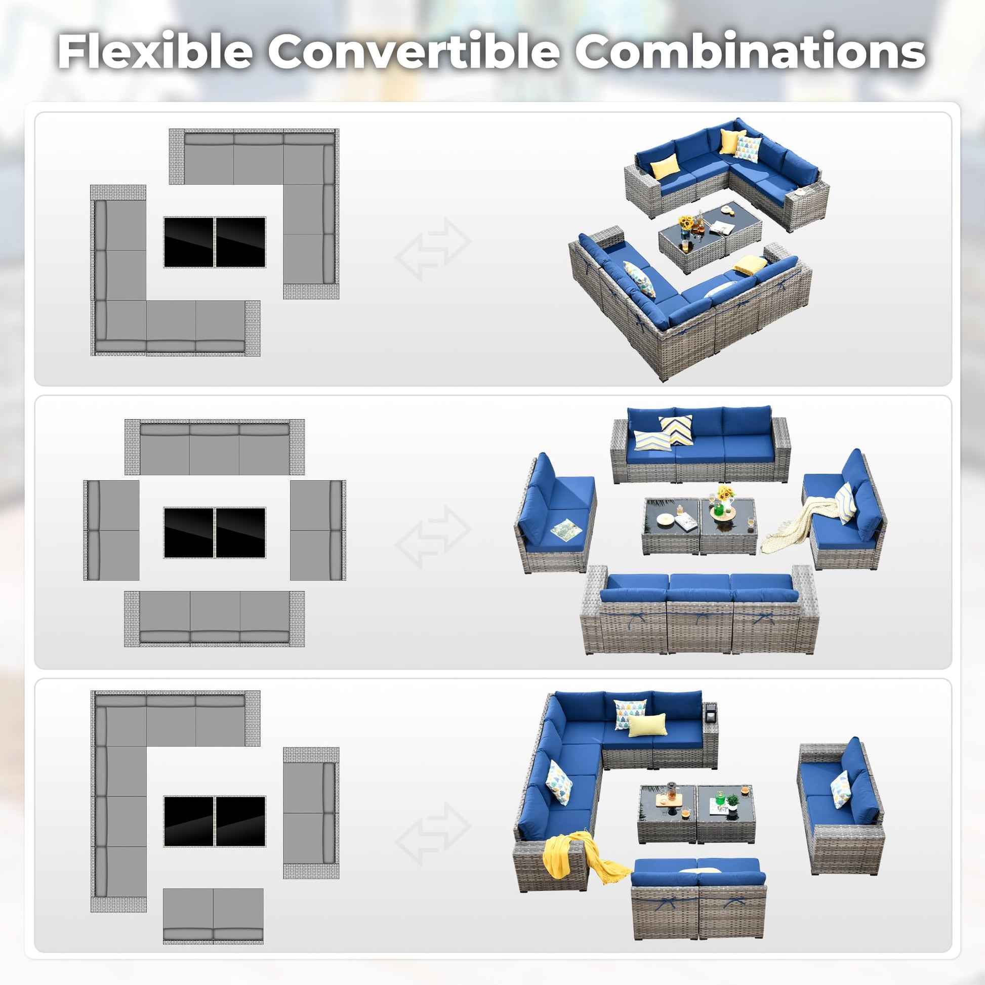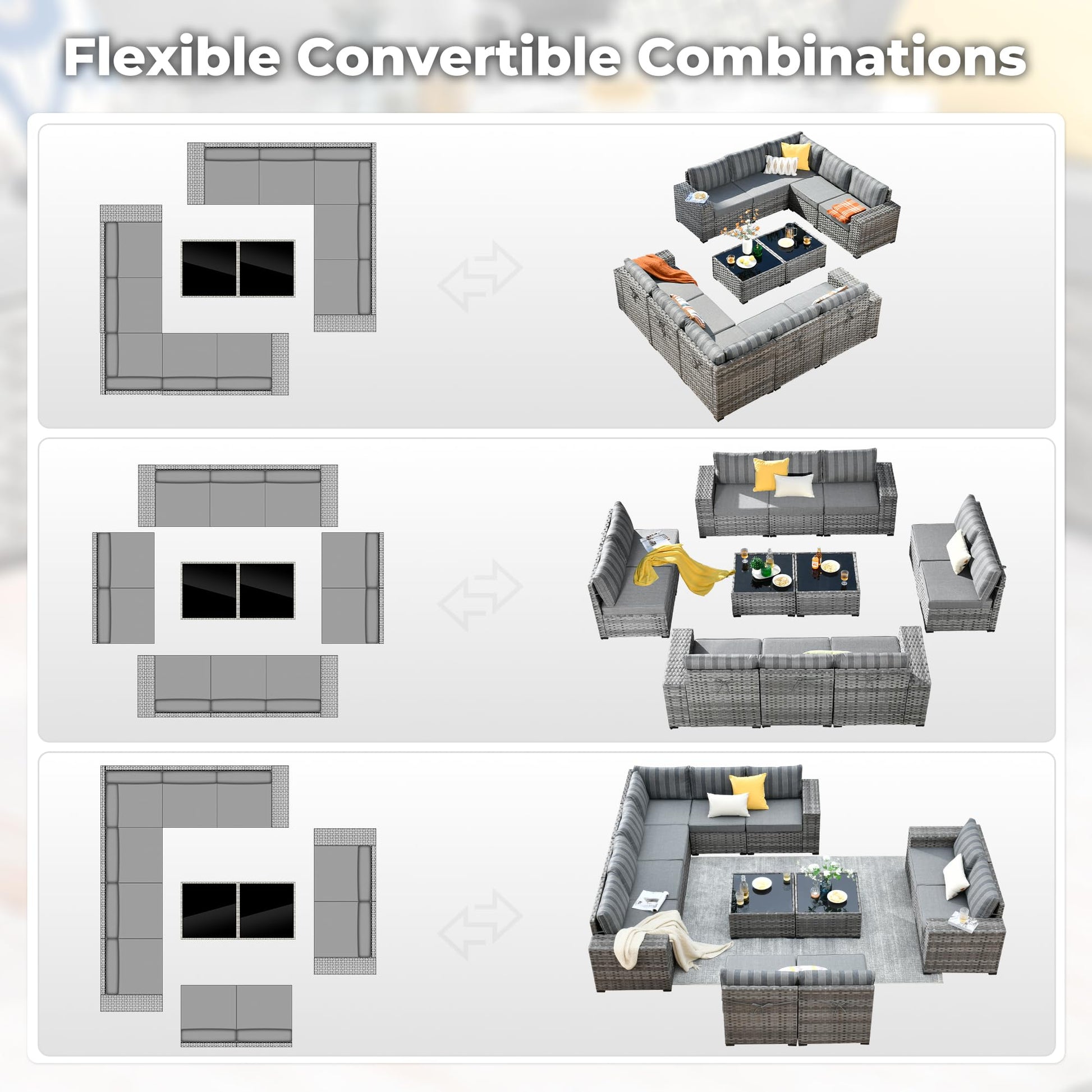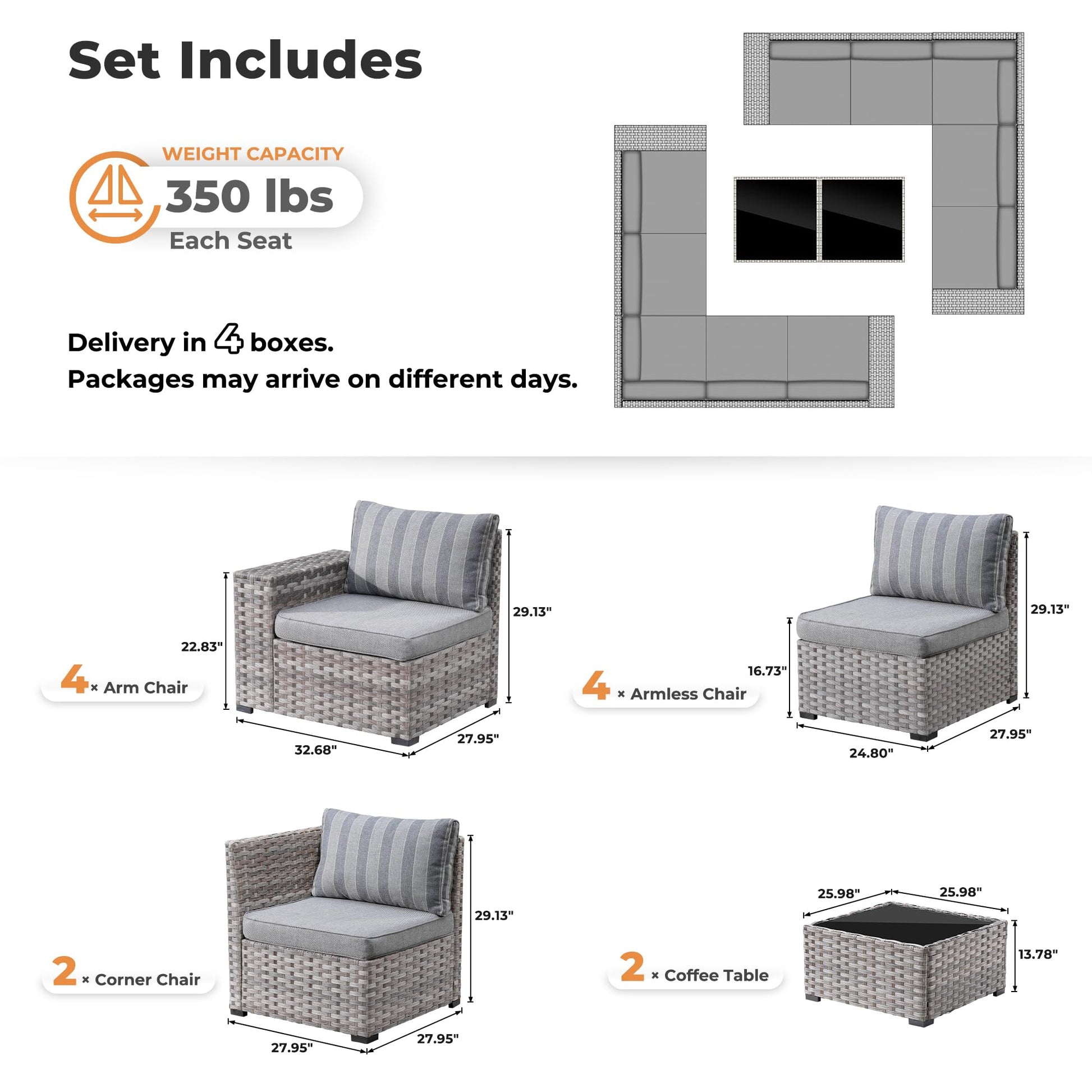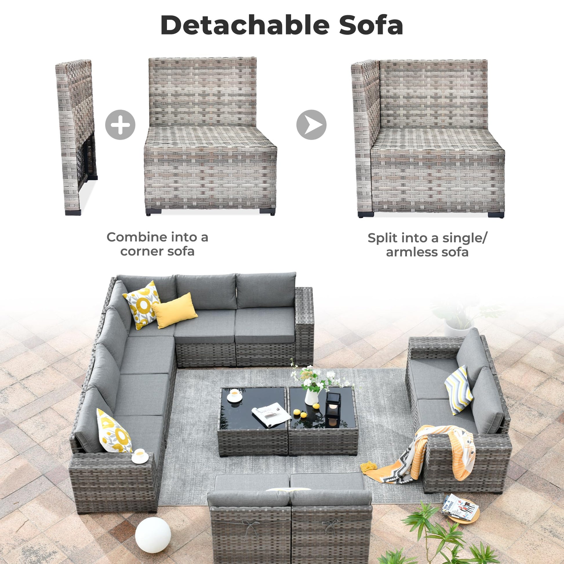Easy Maintenance: Simplify upkeep with cushion covers featuring smooth zippers for easy removal and washing. Crafted from hand-made weather-resistant PE rattan, this all-weather sectional sofa won't rust or fade.