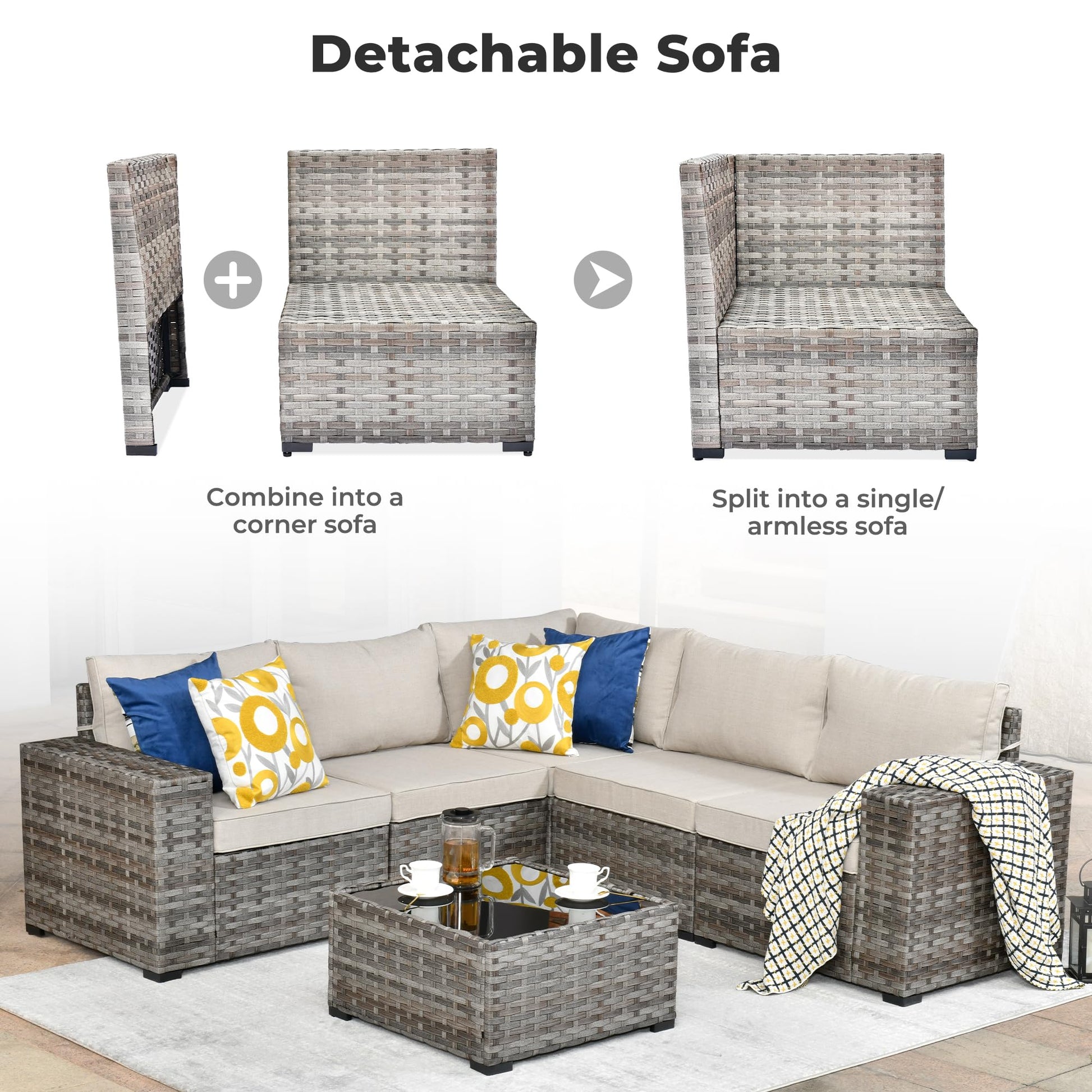 ●Easy Maintenance: Simplify upkeep with cushion covers featuring smooth zippers for easy removal and washing. Crafted from hand-made weather-resistant PE rattan, this all-weather sectional sofa won't rust or fade.