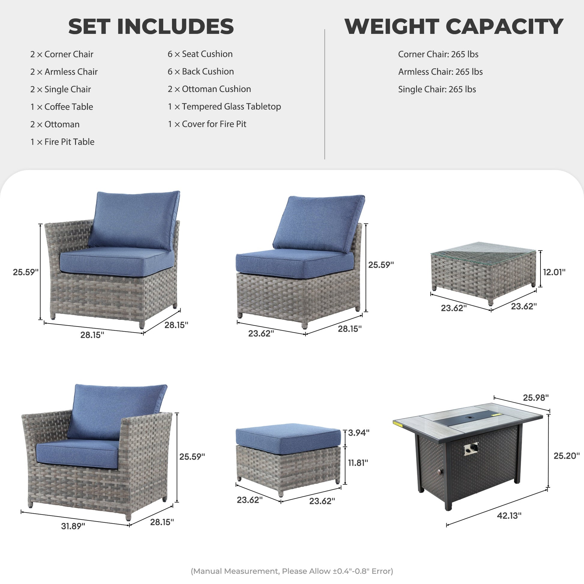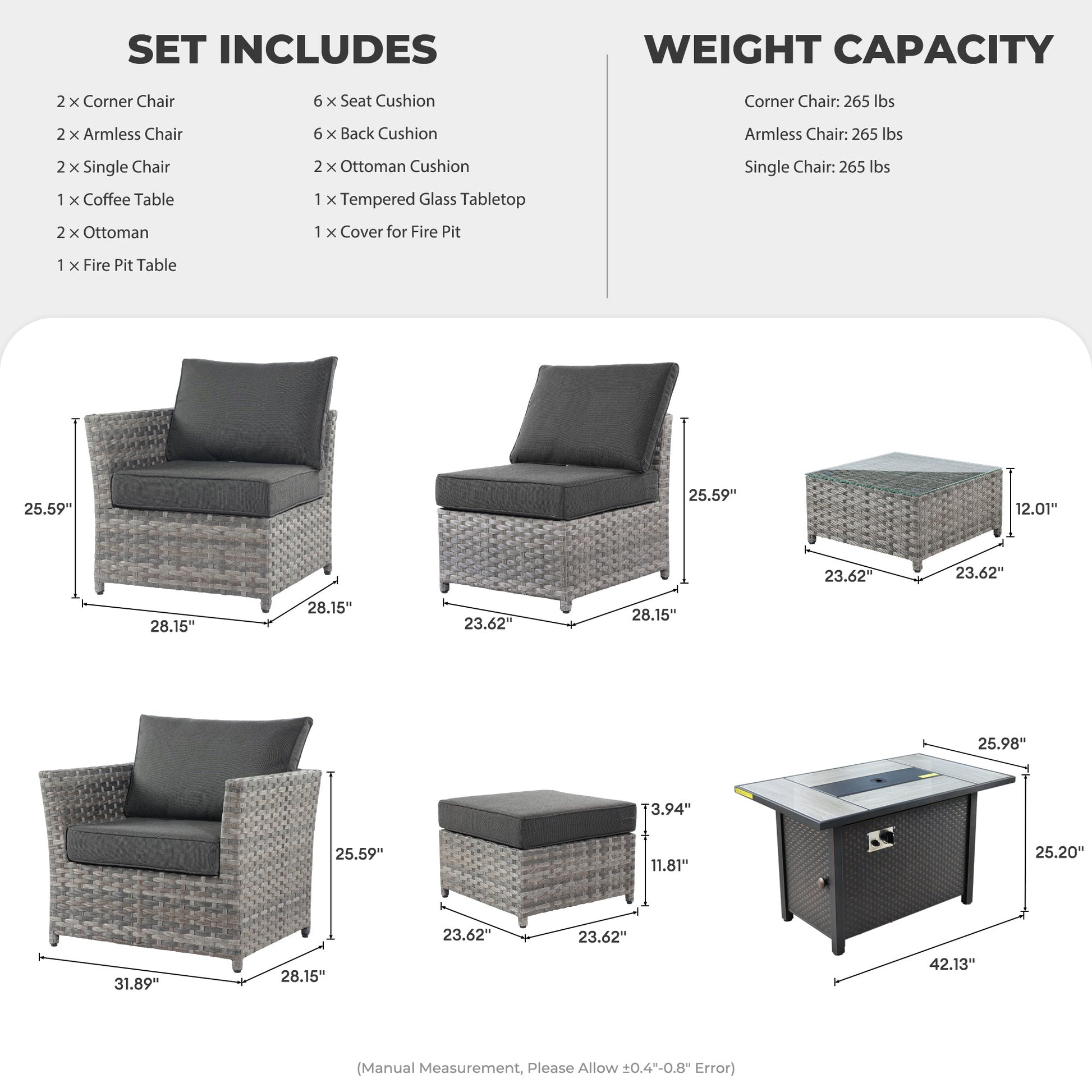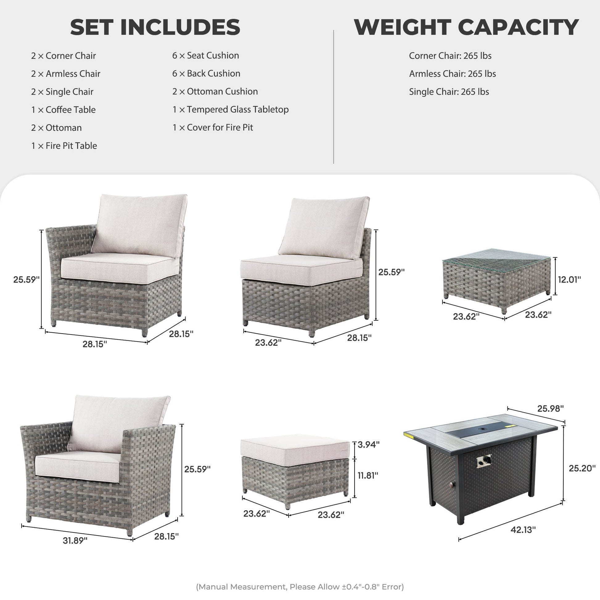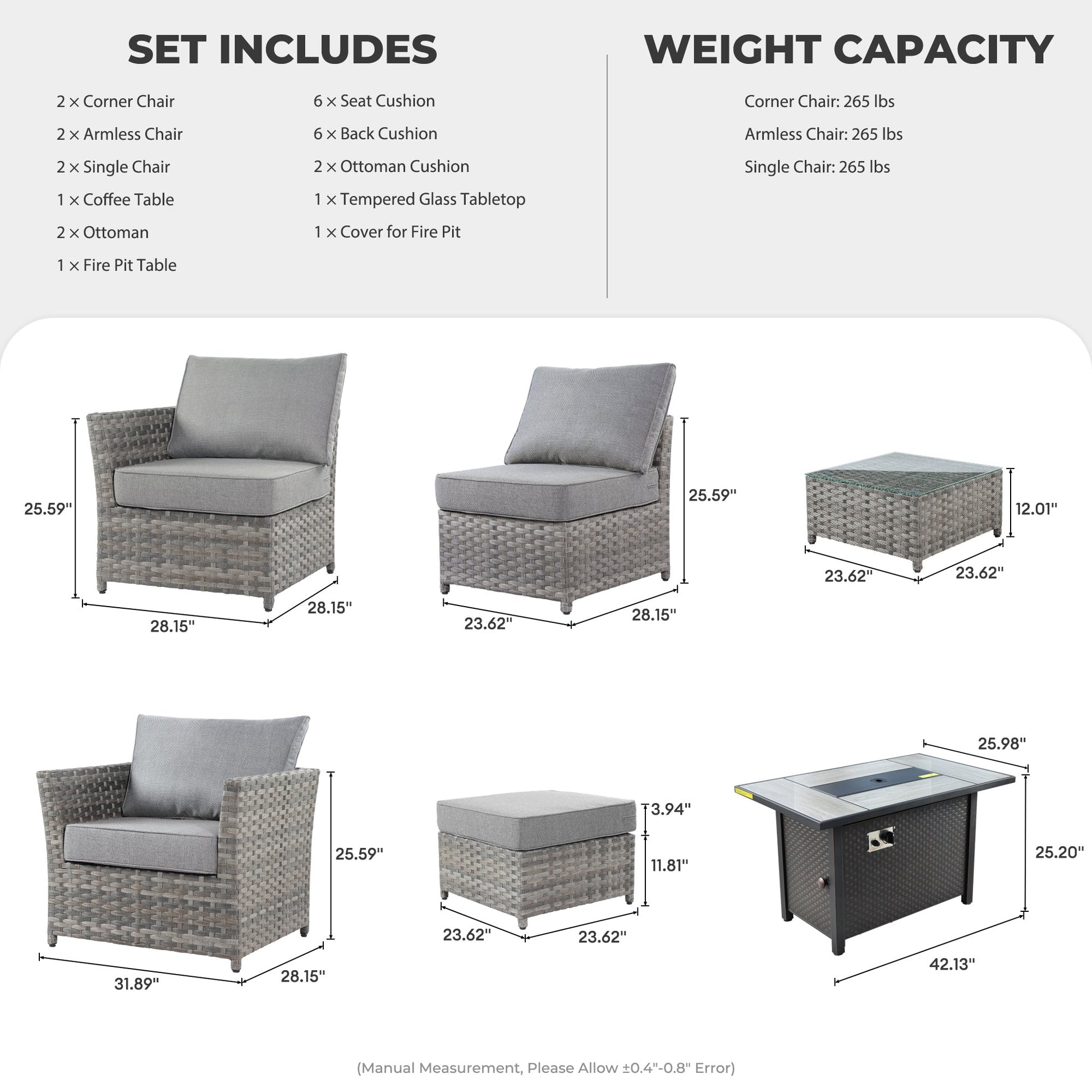 | Items Included: | 10 PCS include: Fully Assembled: Corner Chair * 2; Armless Chair * 2; Single Chair * 2; Ottoman * 2; Coffee Table * 1; Assembly needed: Fire Pit Table * 1 |