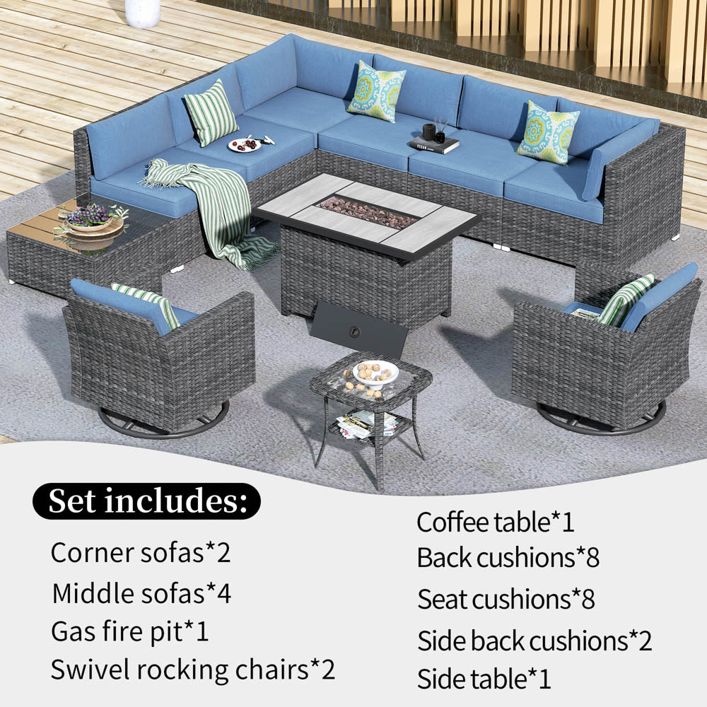 OVIOS Patio Furniture 11-Piece Outdoor Sectional Sofa Set with Wicker Rocking Swivel Chairs and 42.12'' Fire Pit