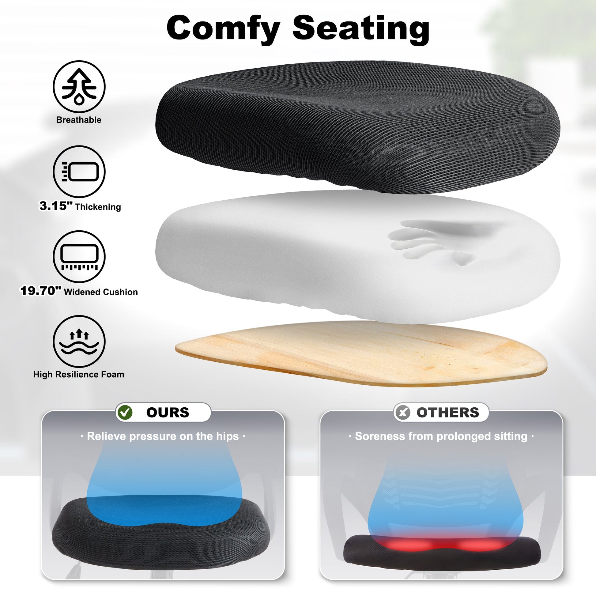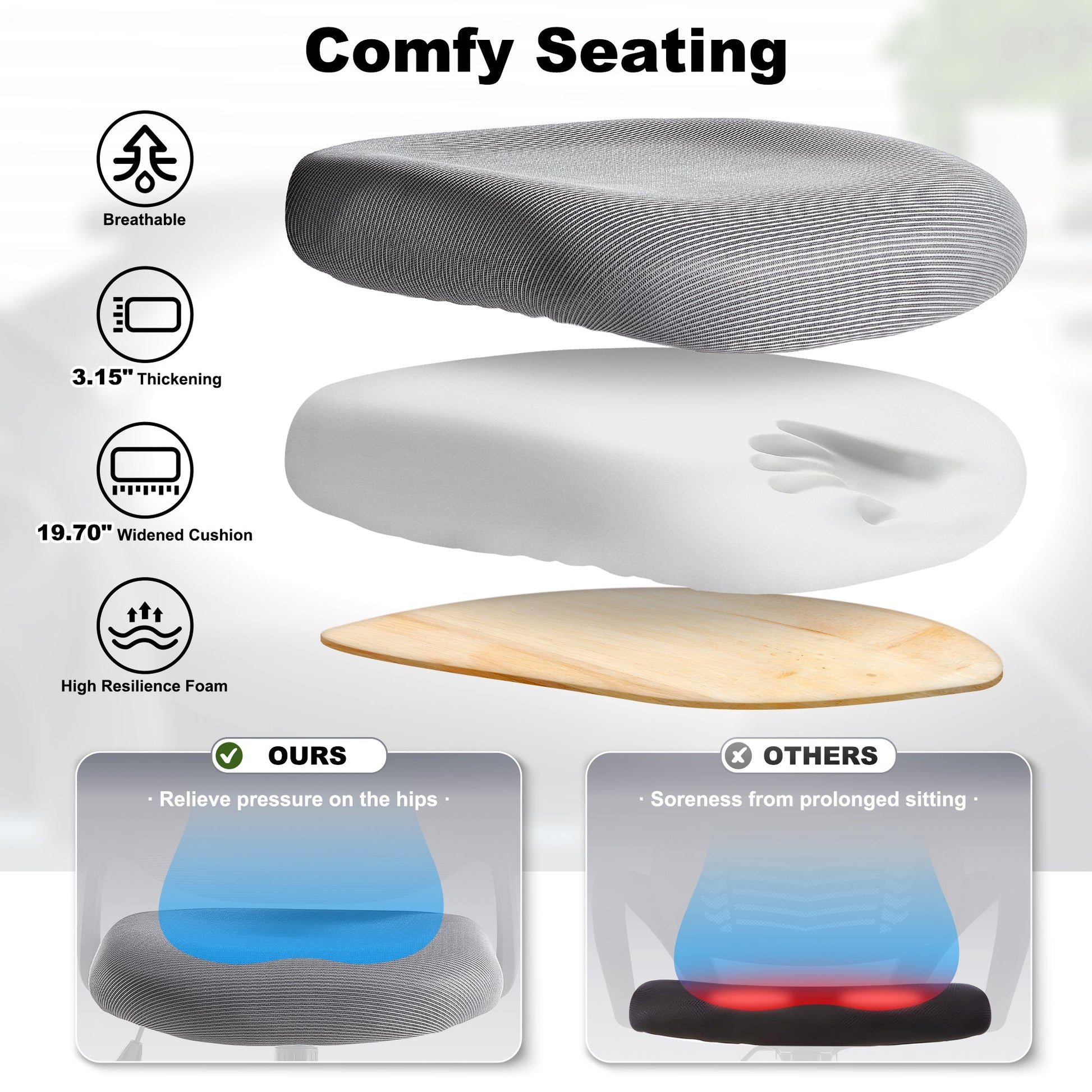 Breathable Comfort Design: Backrest made of breathable, highly elastic mesh material ensures continuous air circulation for a cool and comfortable experience. Seat cushion designed with smooth curves to alleviate pressure on the hips and tailbone. High-density foam strikes a delicate balance between support and comfort, ensuring a pleasant experience even after prolonged sitting.