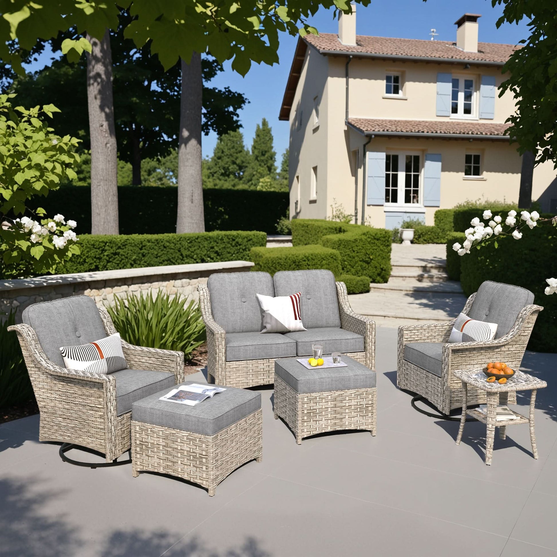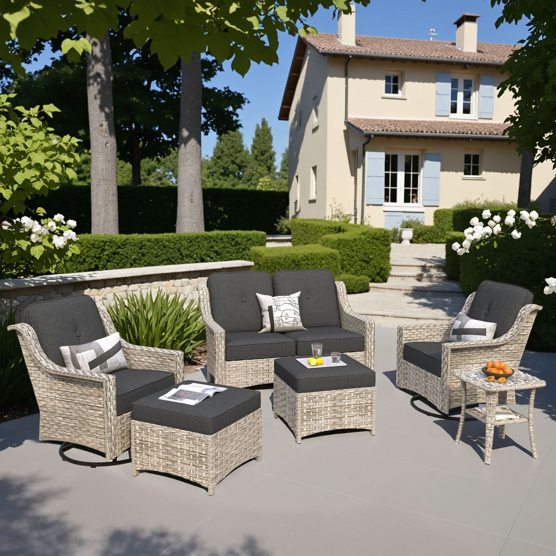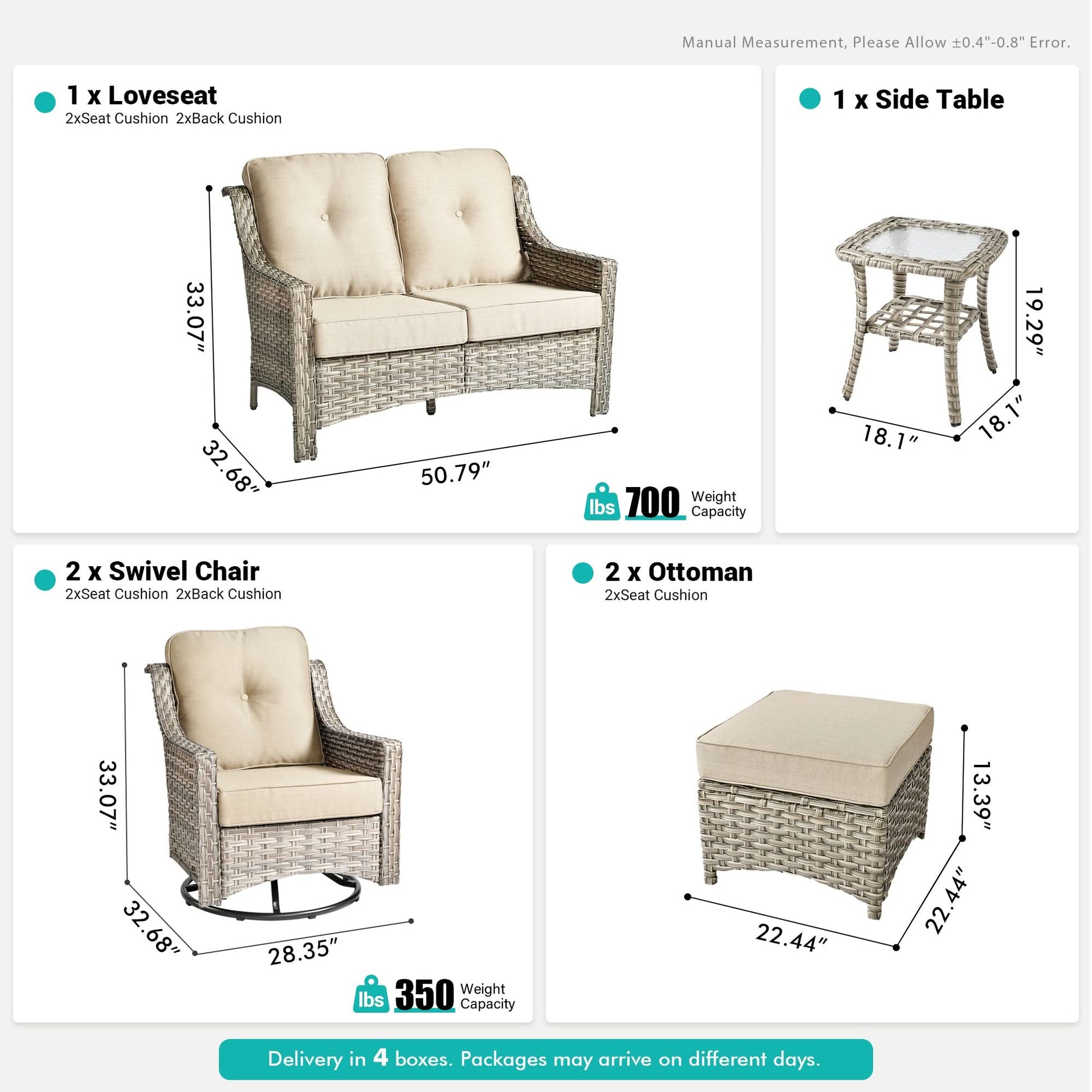 VERSATILE OUTDOOR FURNITURE: This set comprises 1 x 2-seat couch, 2 x swivel rocking chairs, 2 x ottomans, and 1 x 18" side coffee table, offering seating for up to 4. Its sleek, contemporary design enhances any outdoor setting. Ideal for family reunions, social drinks, or quiet book reading, this patio set enhances your outdoor area.