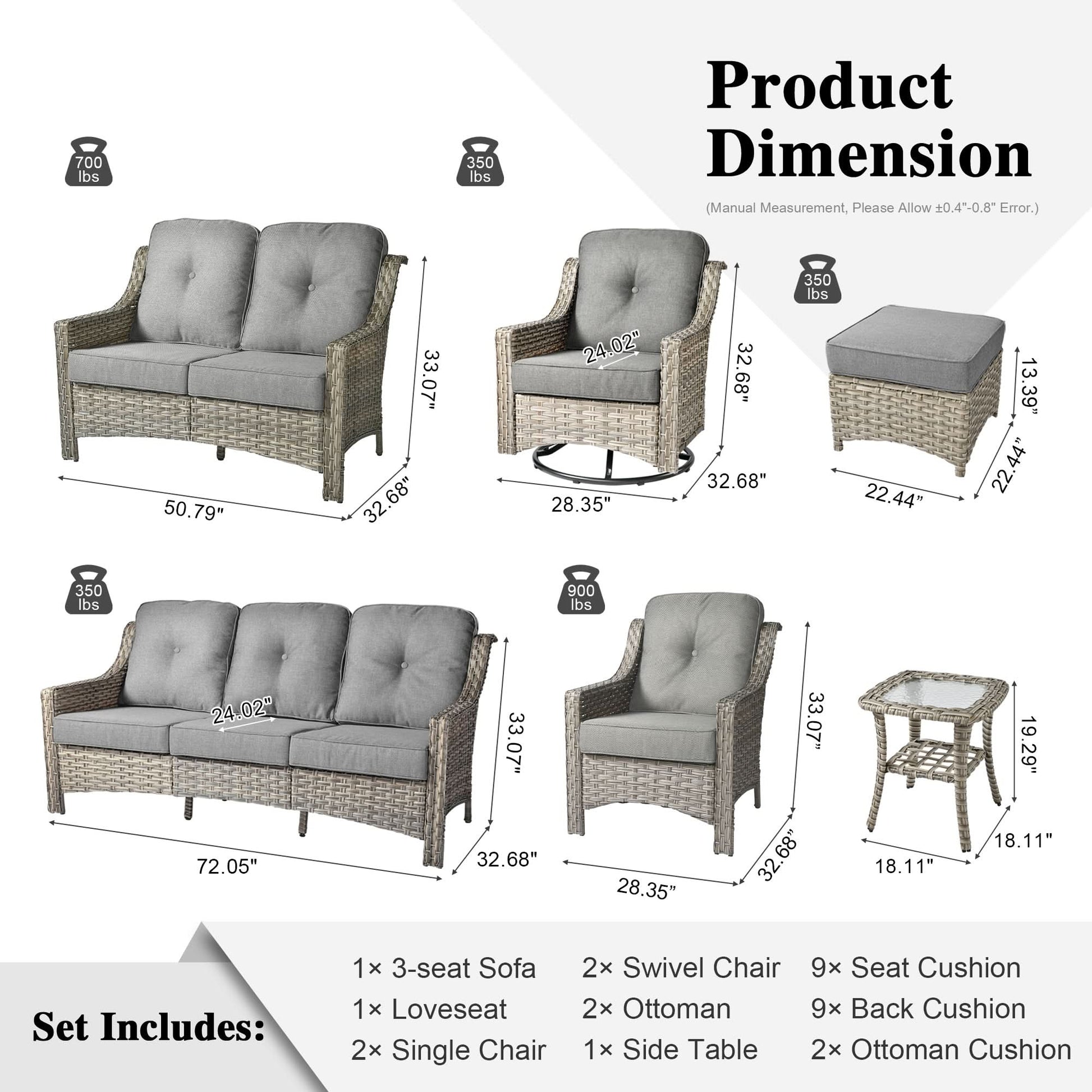 VERSATILE OUTDOOR FURNITURE: This set comprises 1 x 3-seat couch,1 x 2-seat couch, 2 x swivel rocking chairs, 2 x single chairs, 2 x ottomans, and 1 x 18" side coffee table, offering seating for up to 7. Its sleek, contemporary design enhances any outdoor setting. Ideal for family reunions, social drinks, or quiet book reading, this patio set enhances your outdoor area.