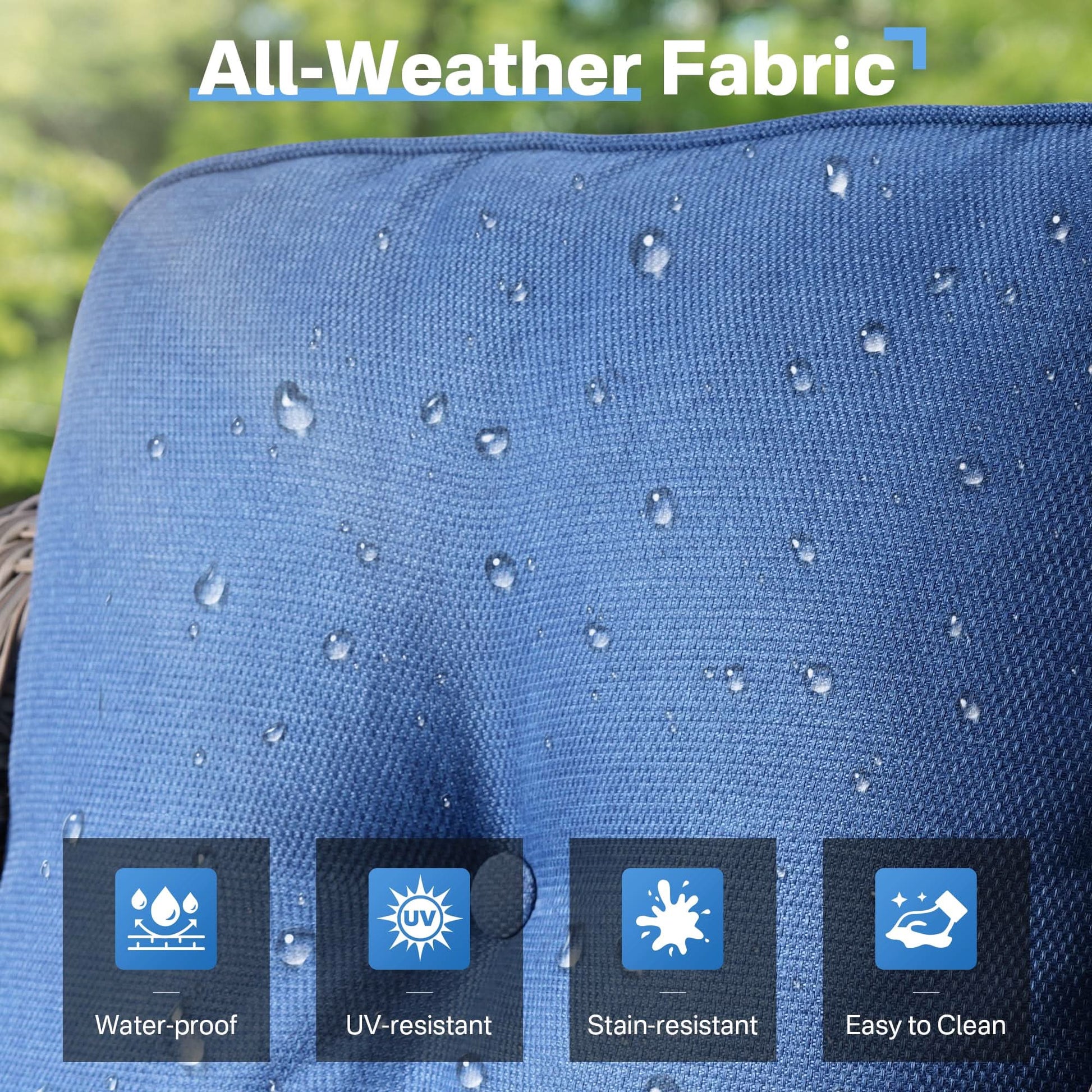 STURDY & DURABLE CONSTRUCTION:Our outdoor furniture is crafted from premium materials. The metal frame is 50% thicker than average, supporting 350 lbs and featuring a three-step coating for enhanced resistance to scratches, peeling, and rust. The all-weather PE wicker is tightly woven to withstand rain, tears, and fading. The cushions' fabric, made with 100% solution-dyed technology, retains color, repels water, and resists spills and stains.