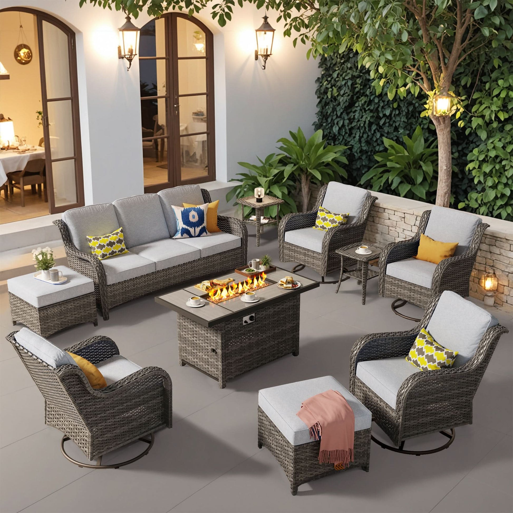 Ovios 10 Pieces Patio Furniture Set with Fire Pit Table Outdoor Wicker Sofa Loveseat and Swivel Rocking Glider Chairs