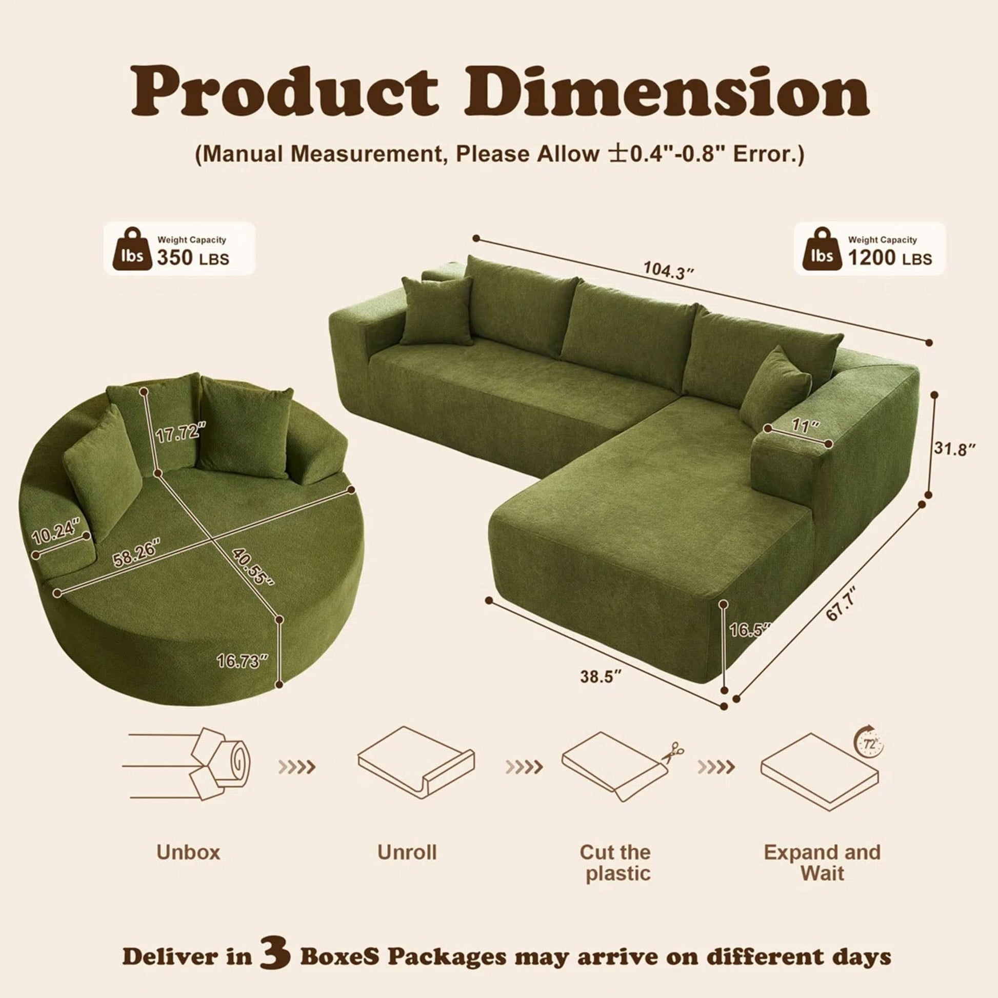 No Assembly Required:Escape the typical furniture setup hassle with our modular cloud lounge. Simply unbox all parts and lightly tap each segment to boost its springiness and poof, bringing it back to its photogenic glory. Complete revival may take up to around 72 hours. Delight in the ease of a no-assembly nirvana!