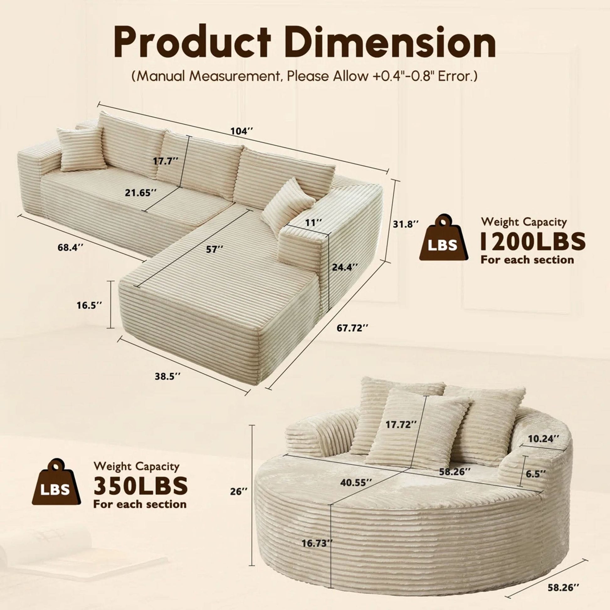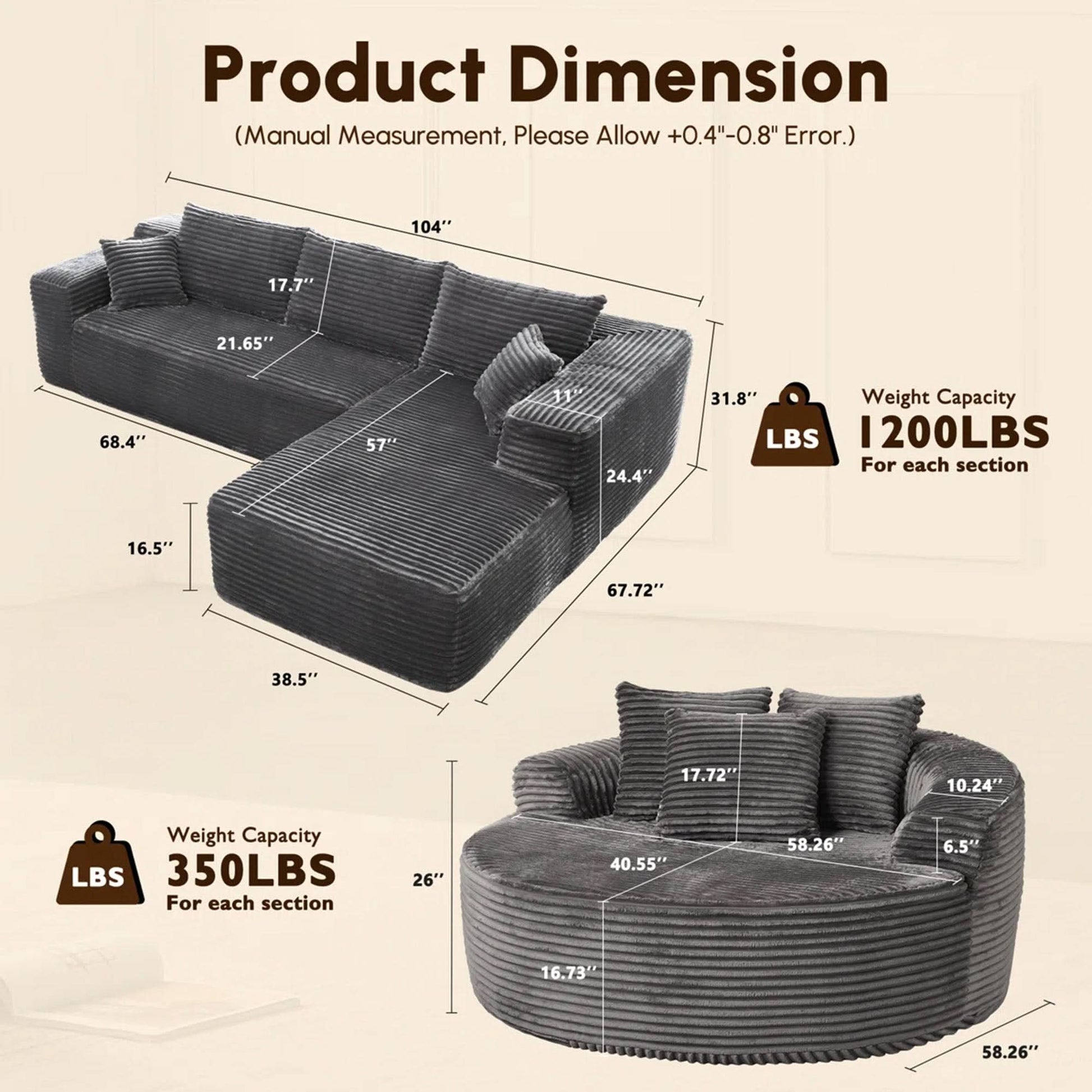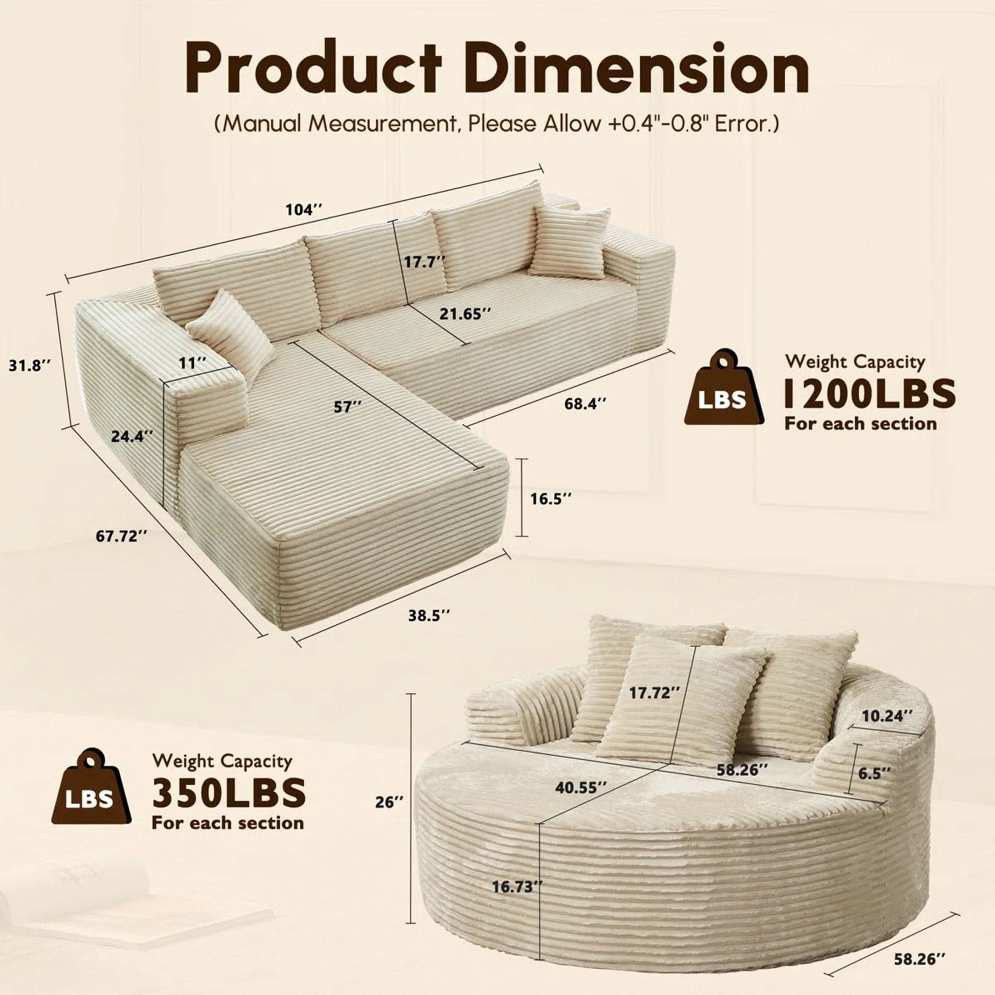 104" W x 67.72" D x 31.8" H 58.26" W x 58.26" D x 26" H |