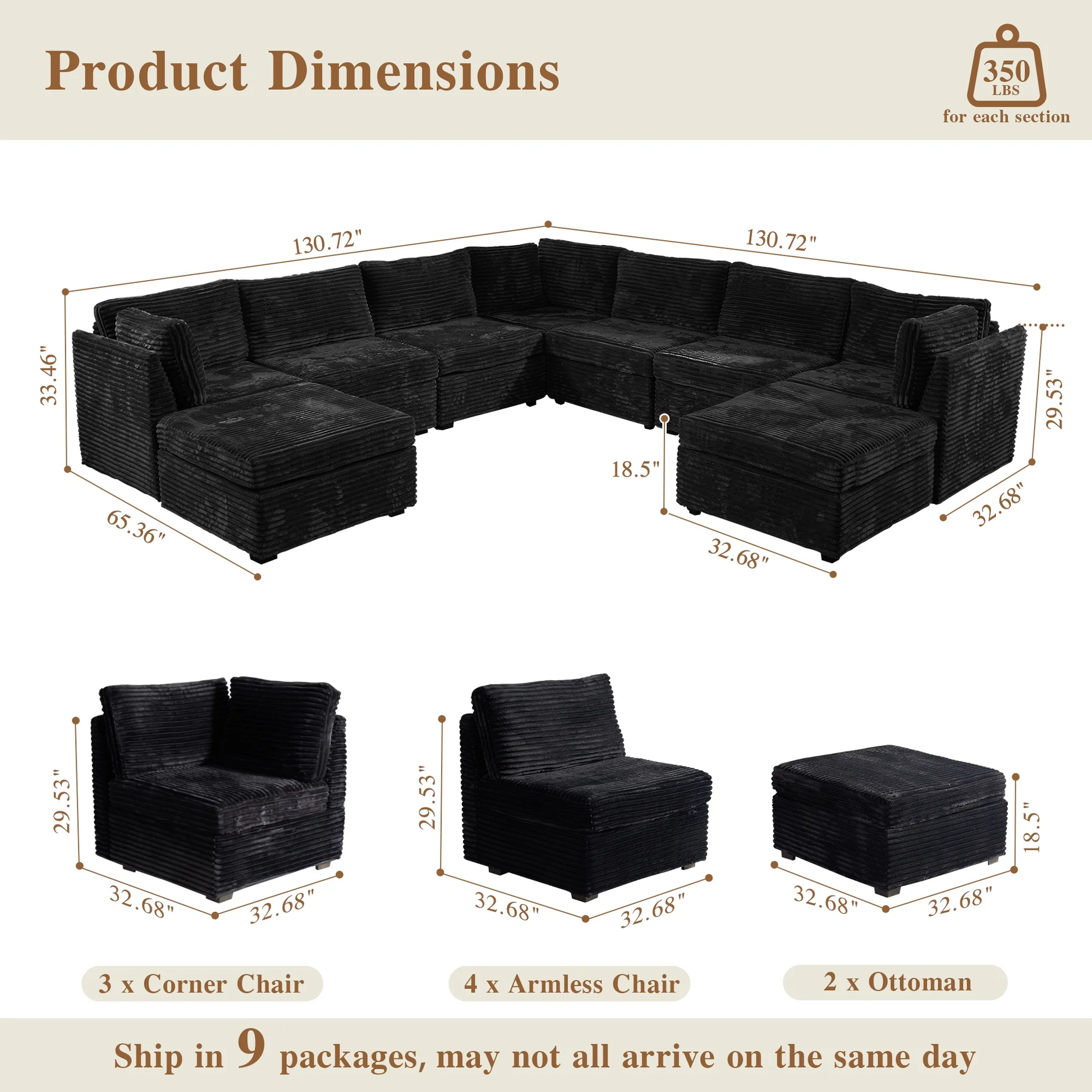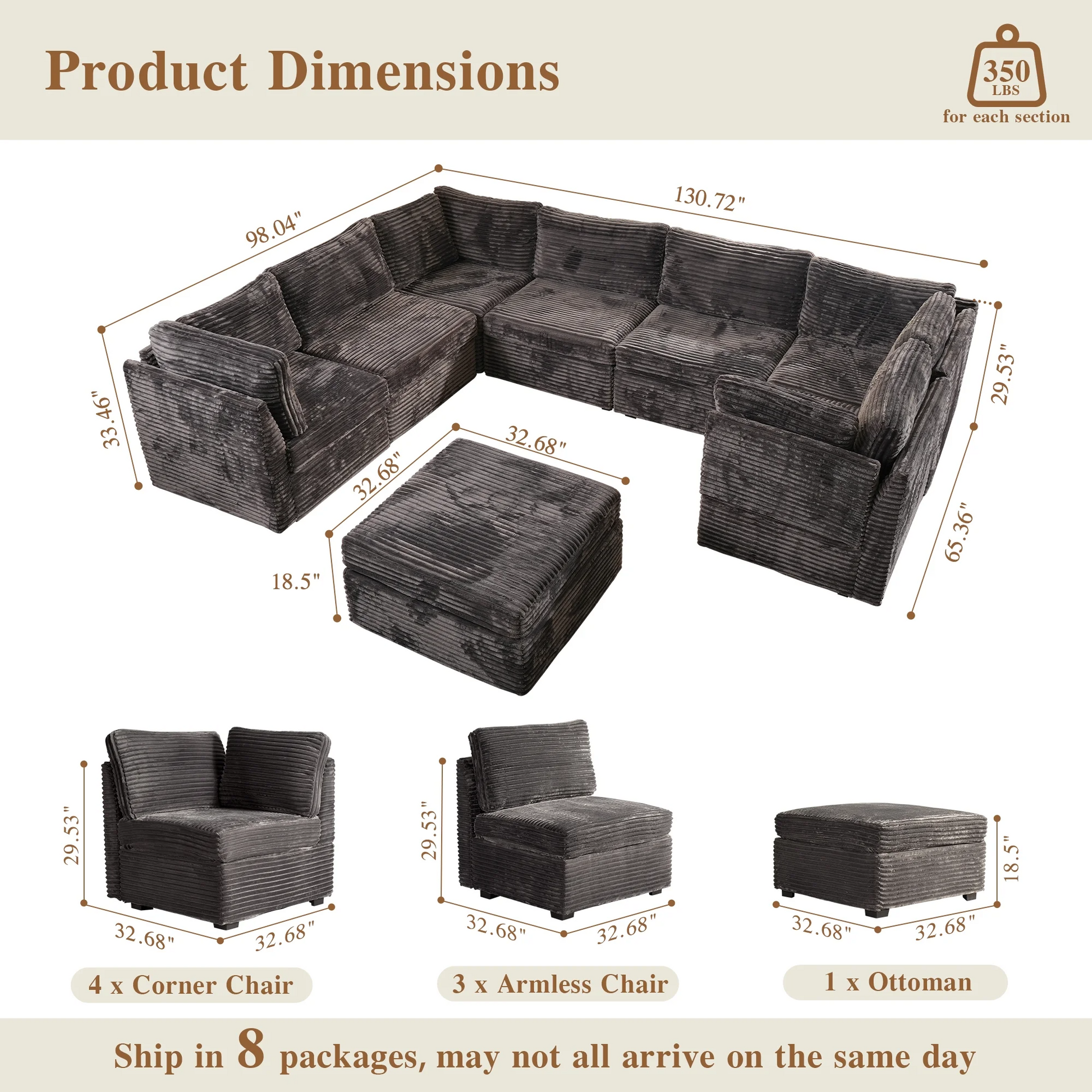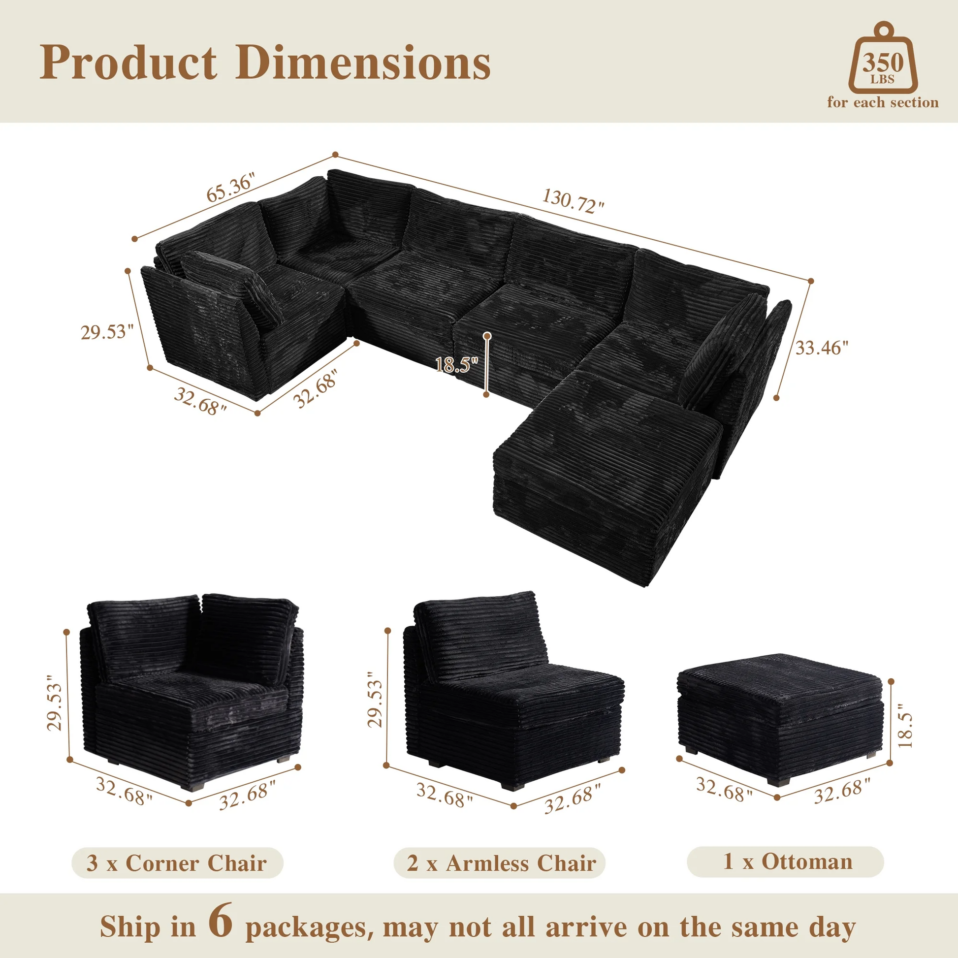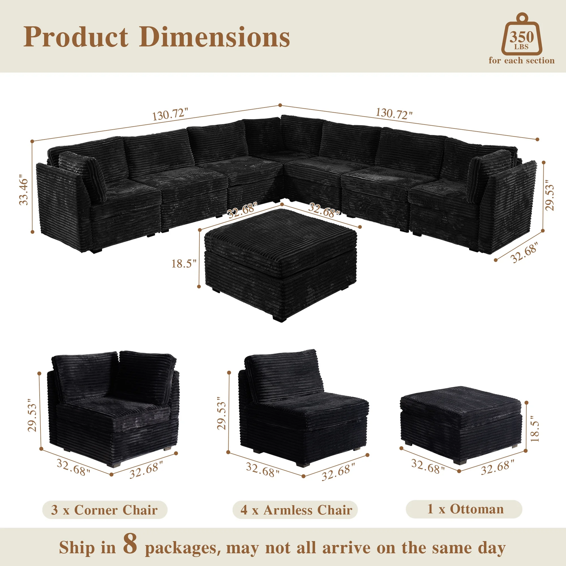 | Ottoman | 18.5"H x 33.32"W x 32.68"D |