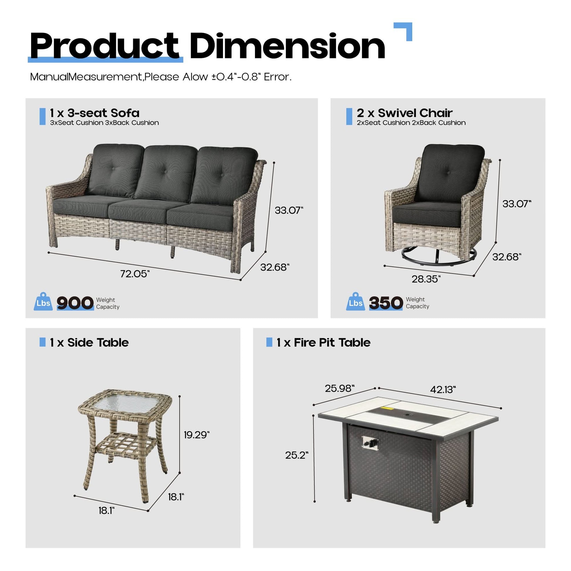 VERSATILE OUTDOOR FURNITURE:This set comprises 1 x 3-seat couch, 2 x swivel rocking chairs, 1 x 25" glowing coffee table, and 1 x 18" side coffee table, offering seating for up to 5. Its sleek, contemporary design enhances any outdoor setting. Ideal for family reunions, social drinks, or quiet book reading, this patio set enhances your outdoor area.