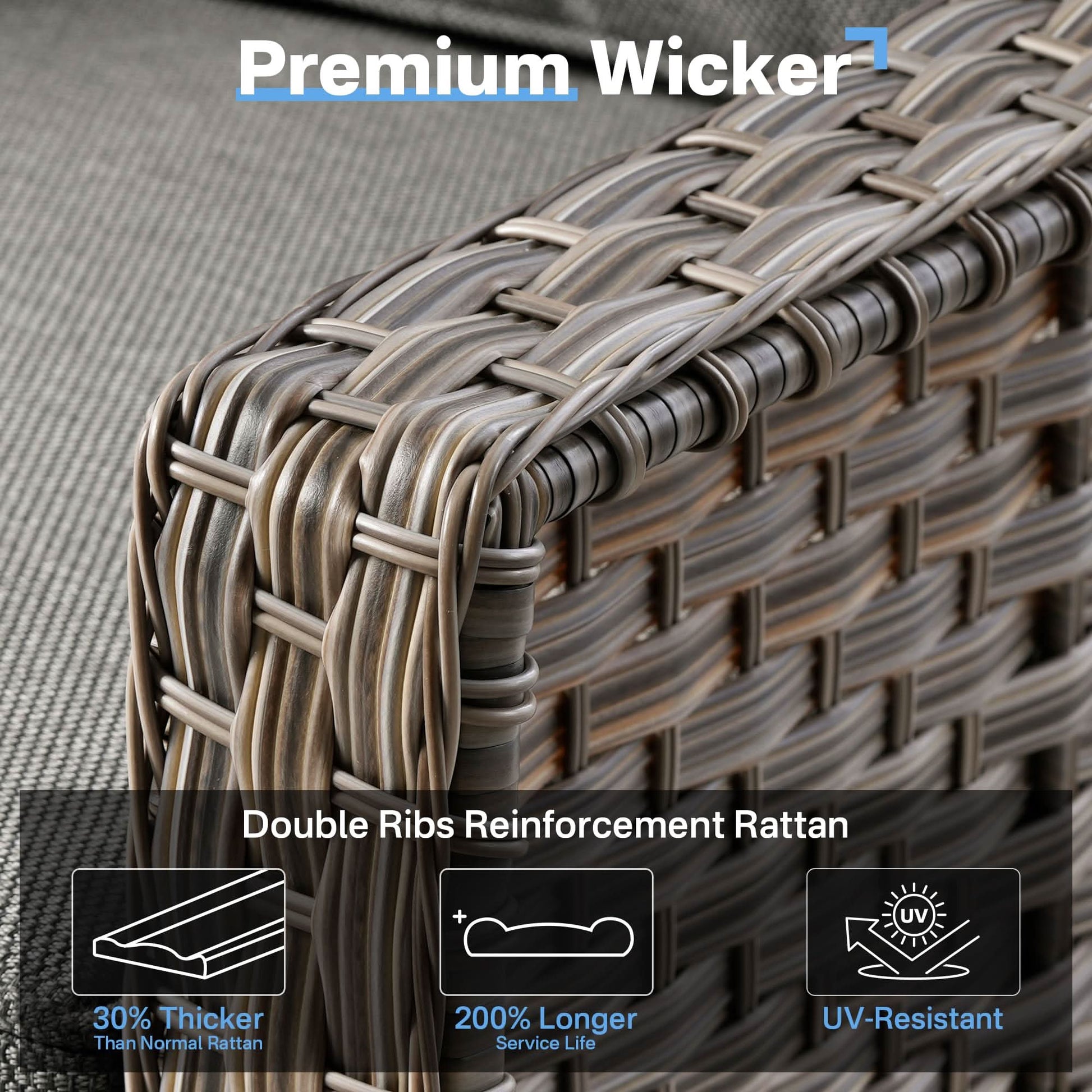STURDY & DURABLE CONSTRUCTION:Our outdoor furniture is crafted from premium materials. The metal frame is 50% thicker than average, supporting 350 lbs and featuring a three-step coating for enhanced resistance to scratches, peeling, and rust. The all-weather PE wicker is tightly woven to withstand rain, tears, and fading. The cushions' fabric, made with 100% solution-dyed technology, retains color, repels water, and resists spills and stains.