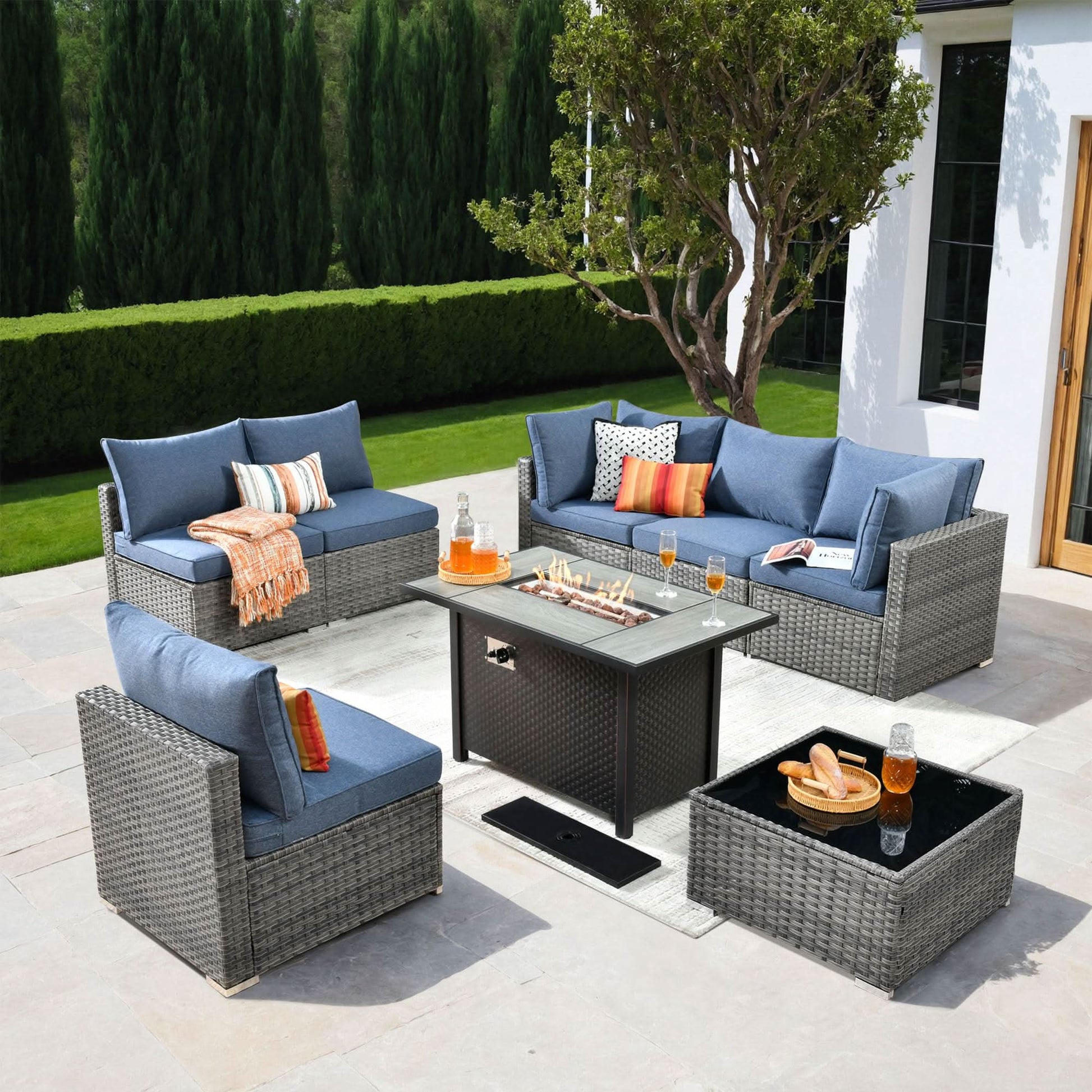 OVIOS Outdoor 8 Piece Patio Furniture Set with Fire Pit Table,Conversation Sectional Wicker Couch with Coffee Table