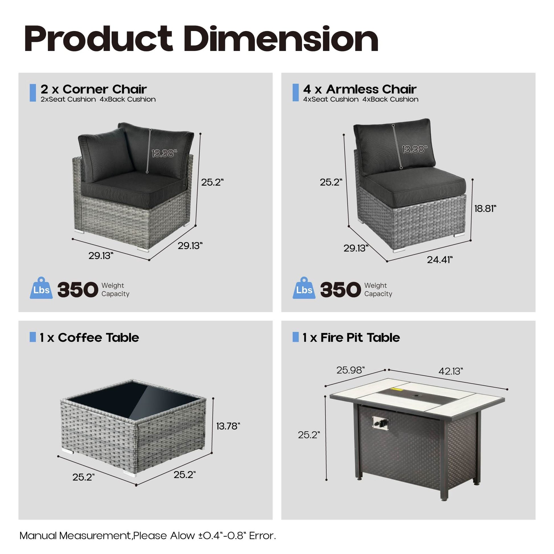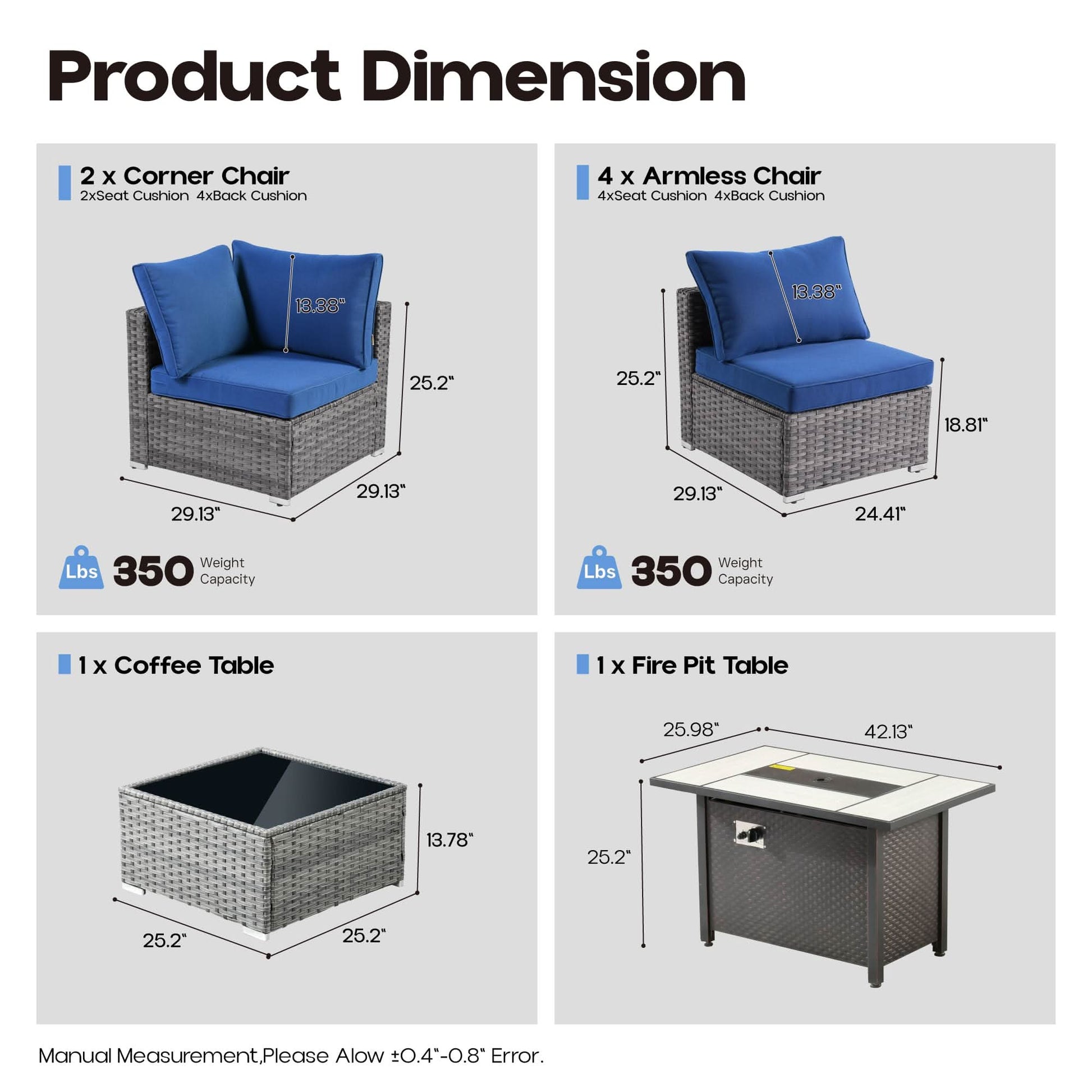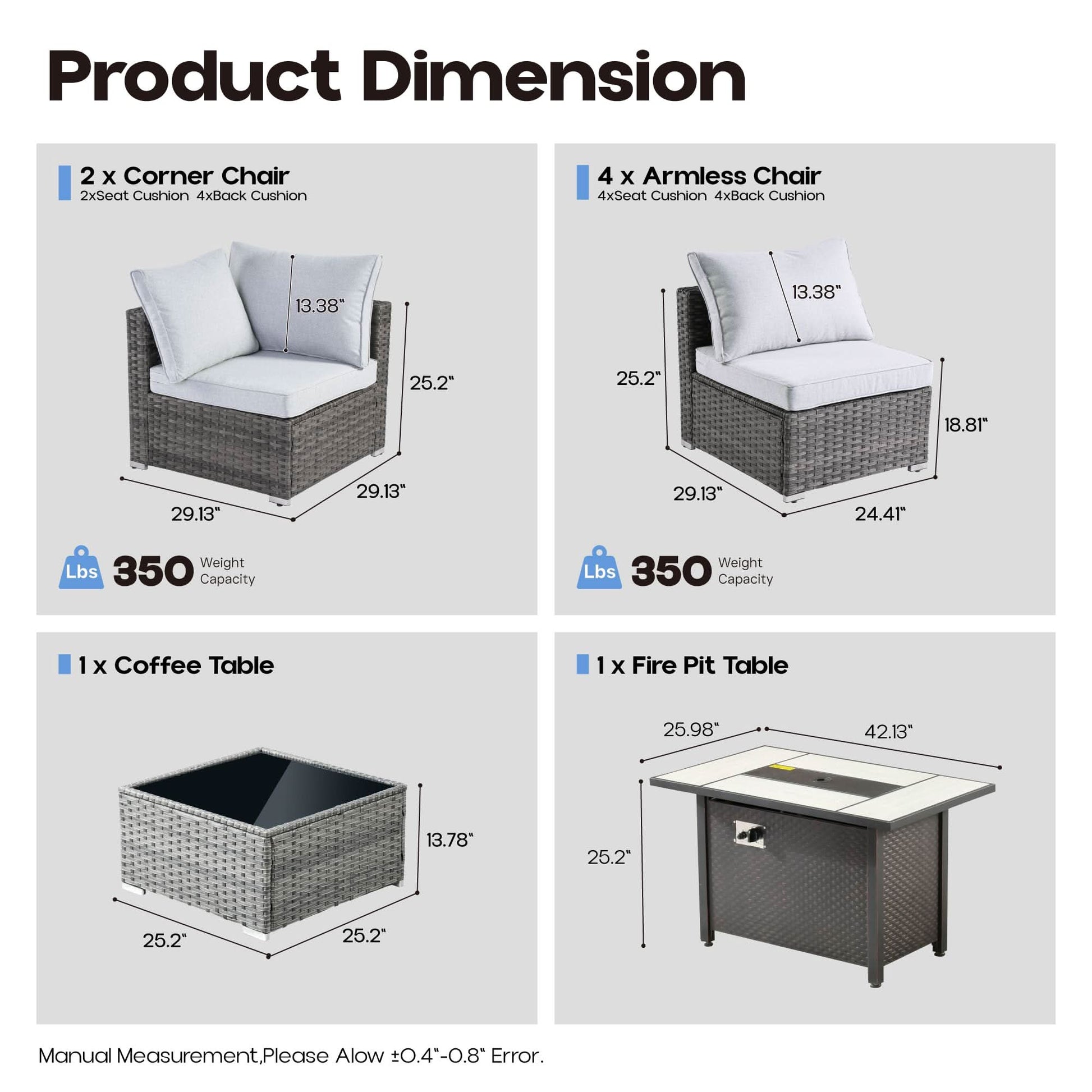 Conversation Set: Package includes 2 corner chair,4 armless chair,1 coffee table,1 propane fire pit table,6 seat cushion,8 back cushion.Versatile outdoor PE wicker sofa, perfect for various settings. Ideal for Outdoor meeting,backyard gatherings, patio lounging, or poolside relaxation. Its low-profile design adds a touch of elegance to any space