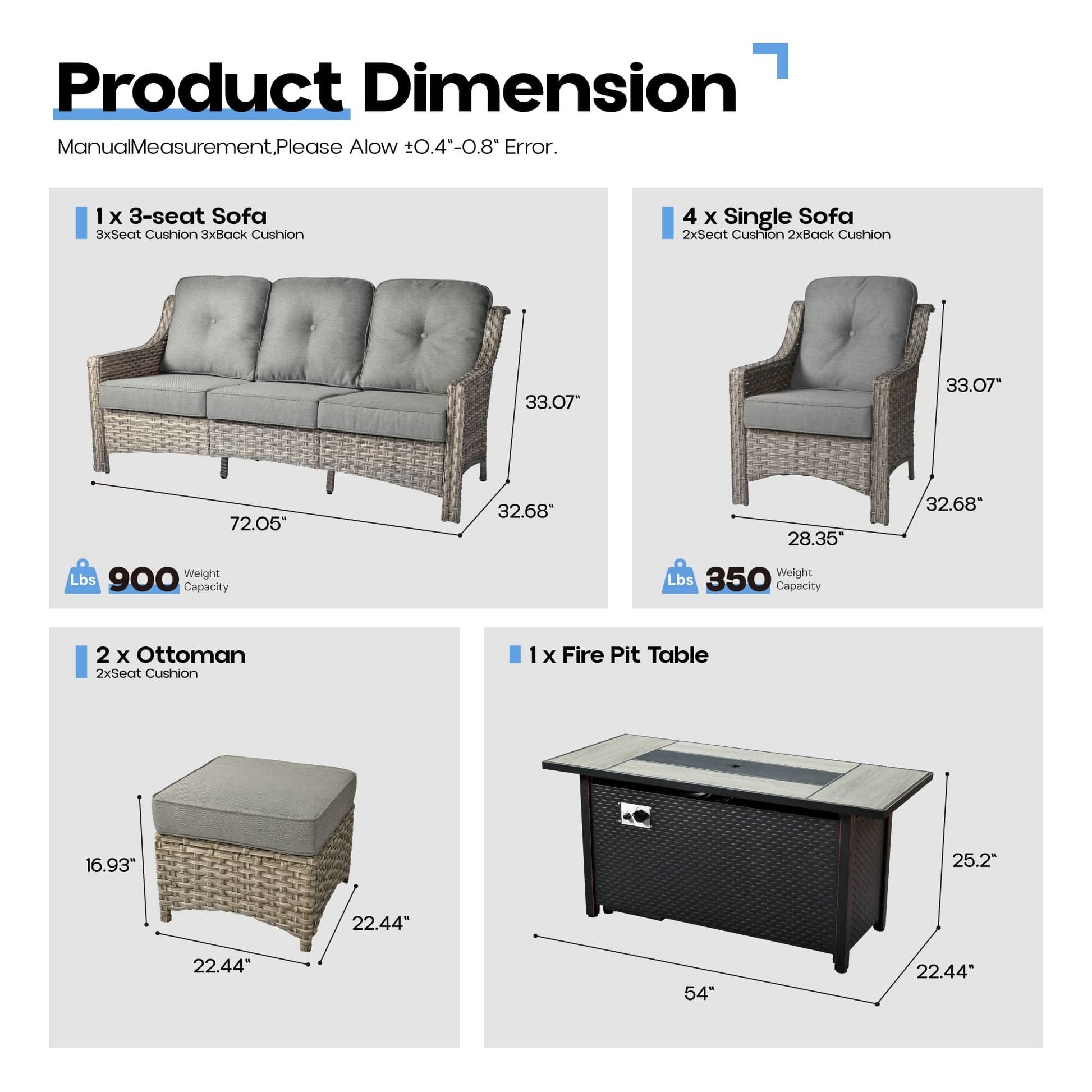 VERSATILE OUTDOOR FURNITURE:This set comprises 1 x 3-seat couch, 4 x single chairs,2 x ottomans, and 1 x 54" fire pit table, offering seating for up to 7. Its sleek, contemporary design enhances any outdoor setting. Ideal for family reunions, social drinks, or quiet book reading, this patio set enhances your outdoor area.