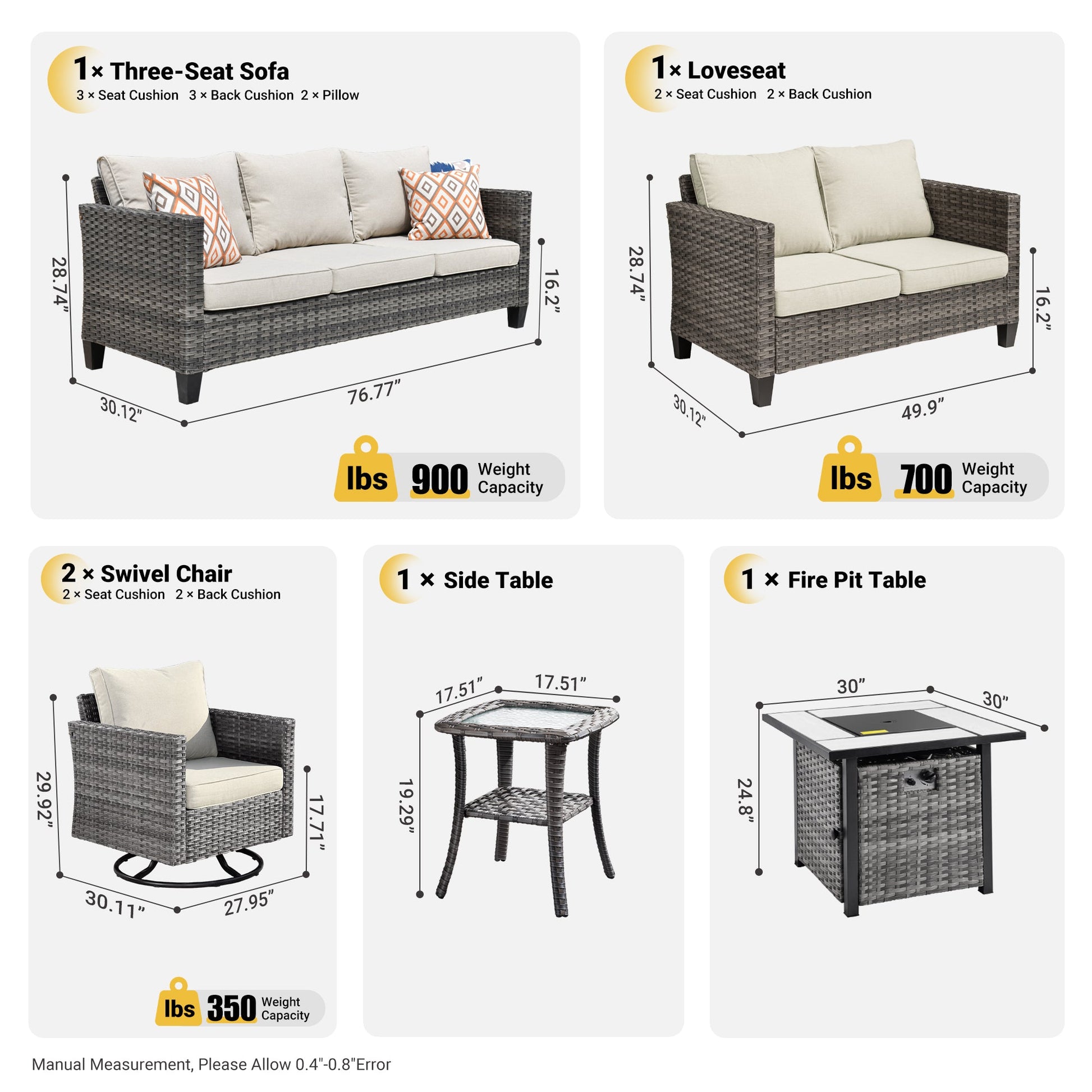 | Items Included | 6 PCS include: Fire Pit Table*1,Sofa*1,Loveseat*1,Swivel Chair*2,Side Table*1 |