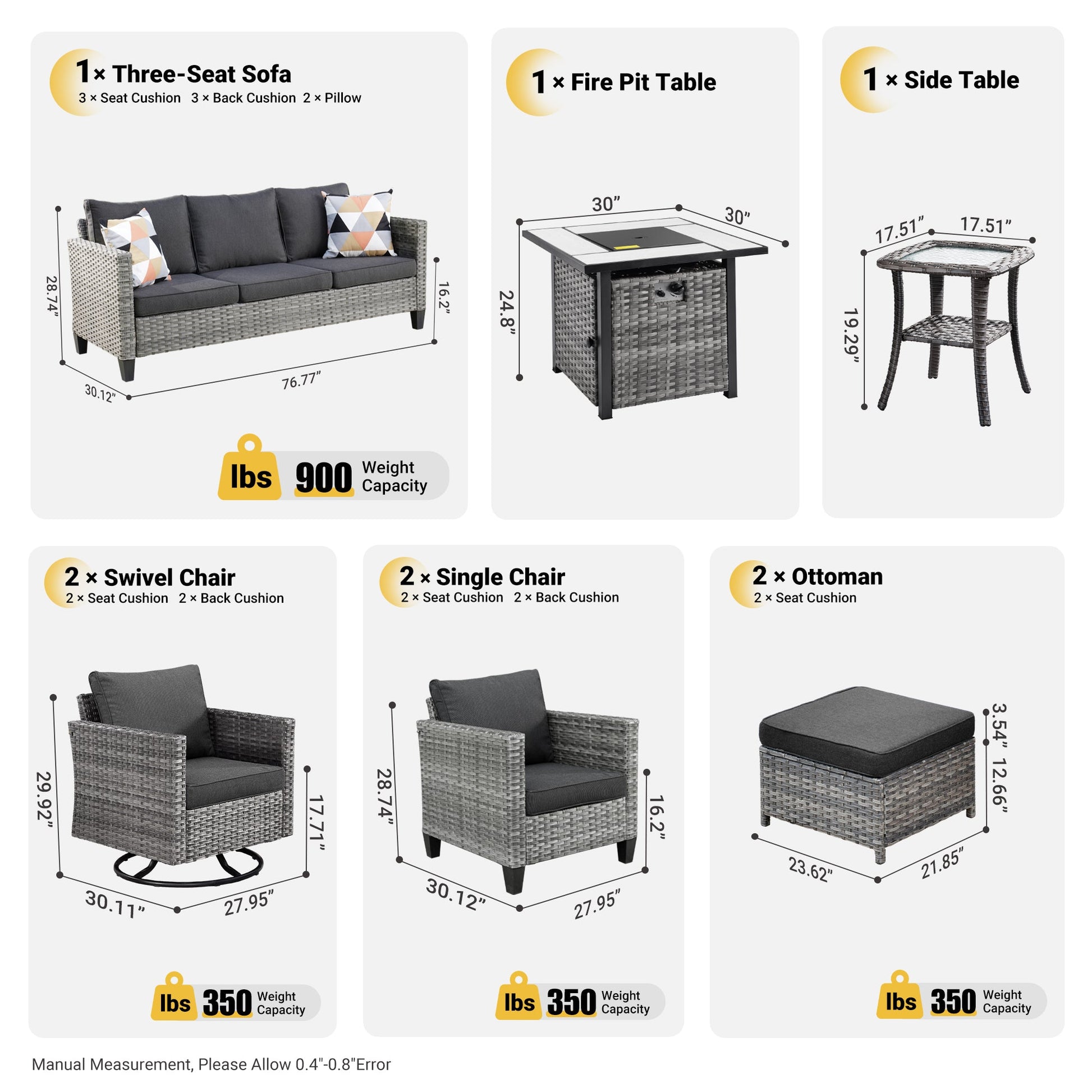 | Items Included | 9 PCS include: Fire Pit Table*1,Sofa*1, Swivel Chair*2,Sigle Chair*2, Ottoman*2, Side Table*1 |
