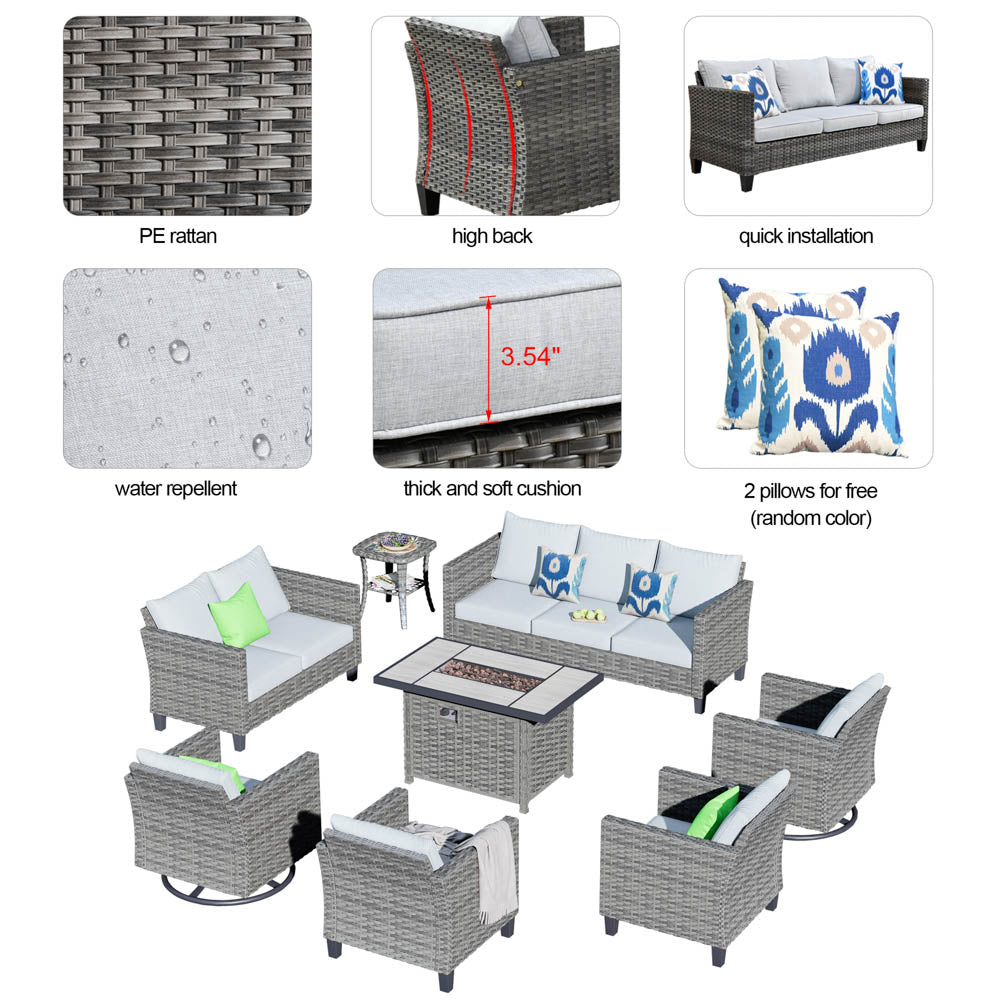 | Items Included | 8 PCS include: Fire Pit Table*1,Sofa*1,Loveseat*1,Swivel Chair*2,Single Chair*2,Side Table*1 |