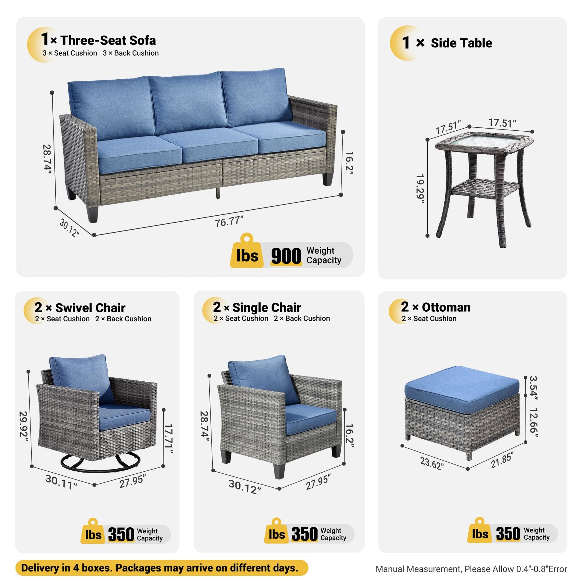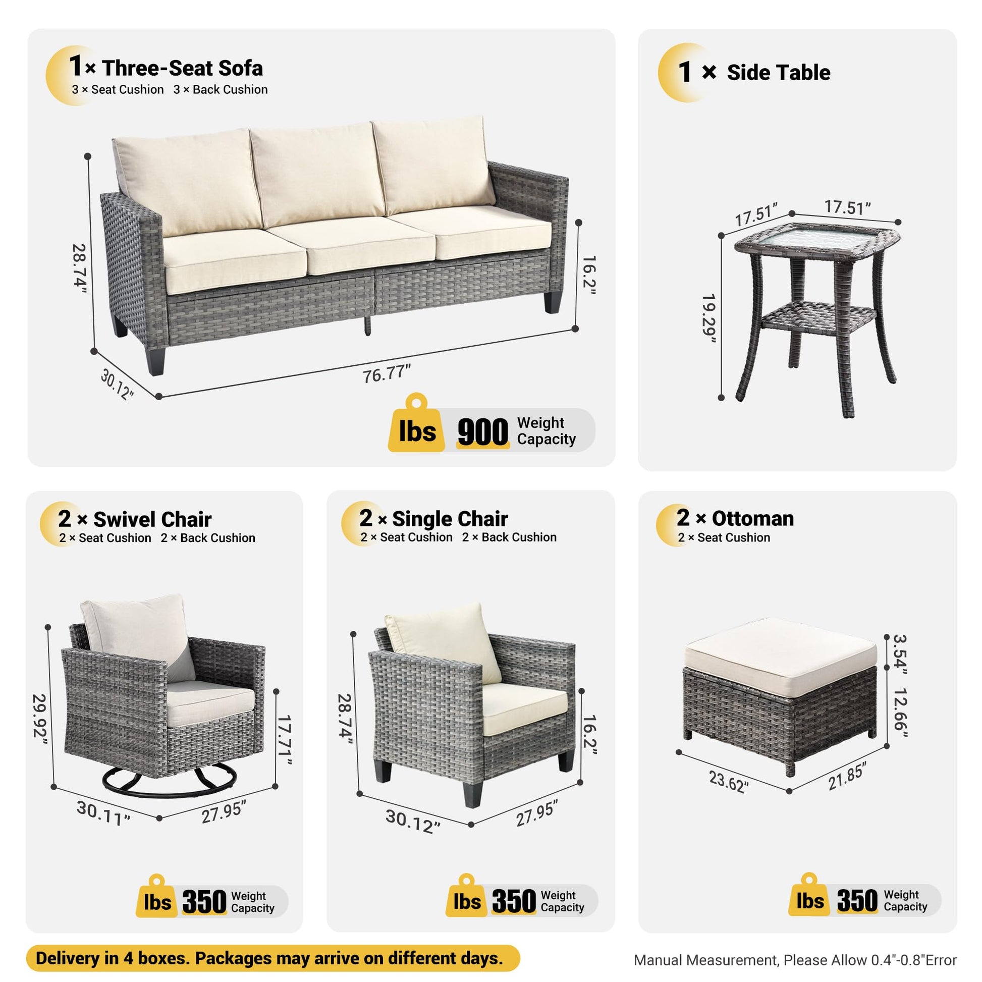 Items Included | 8 PCS include: Sofa*1, Swivel Chair*2, Single Chair*2, Ottoman*2, Table*1 |